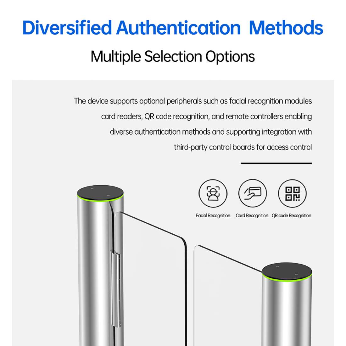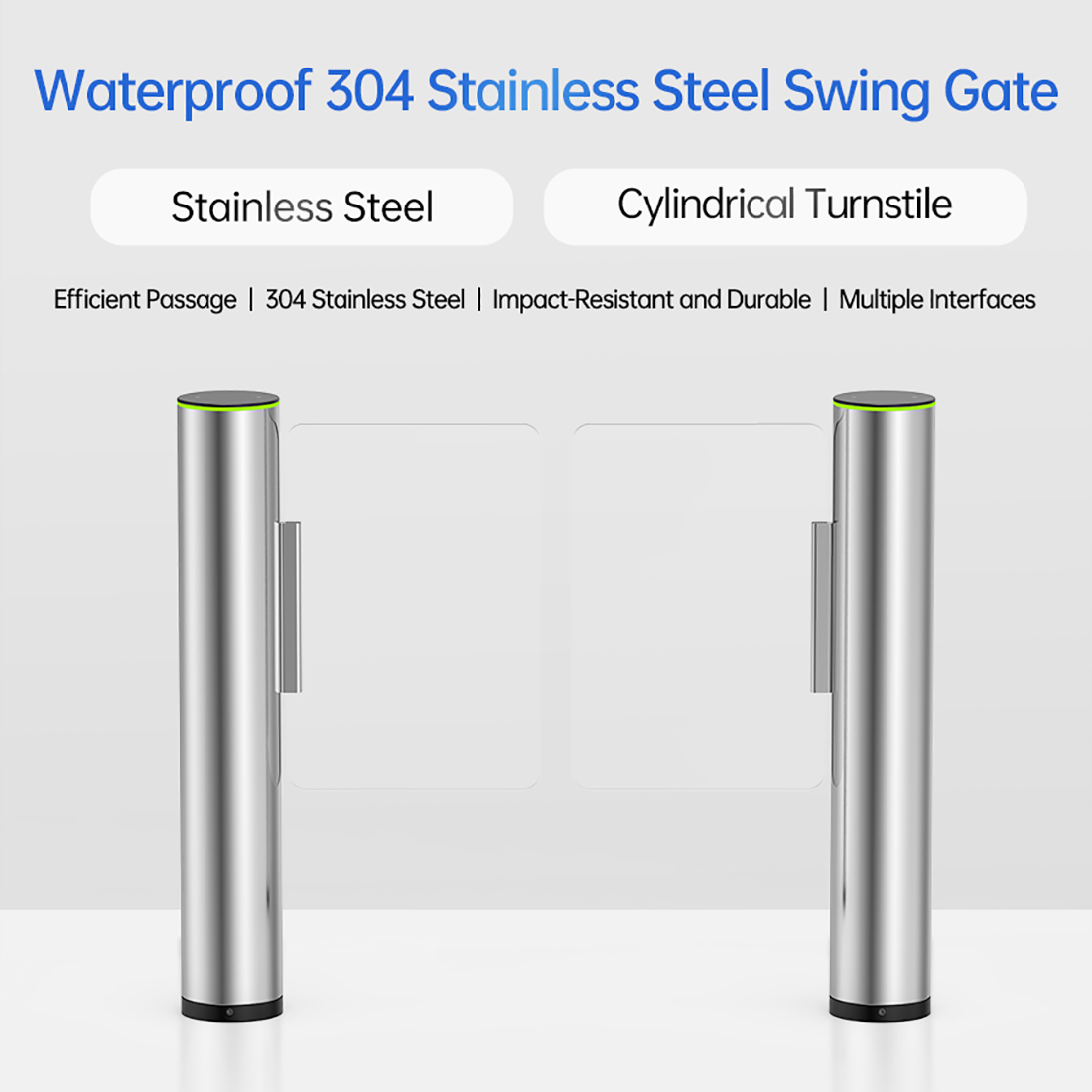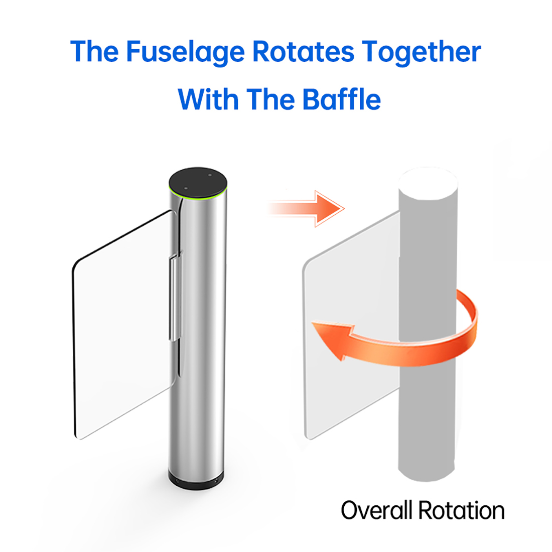 Power-assisted Drive DC brushless motor Safety Mode Automatic gate opening after power failure Rotation Mode Positioning driver Baffle Materials Acrylic / Tempered glass Movement Materials ntegrally die-cast brushless motor Body Materials Main part made of 1.9mm 304 stainless steel Dimensions (mm) Diameter: 168mm Height: 1022mm Door Opening Method Center-split opposite opening mode Door Opening Speed 0.3~0.7 seconds (user-adjustable) Passage Width Standard 900mm (customizable) Movement Service Life 5 million cycles Power Supply AC 100~230V / 50~60Hz